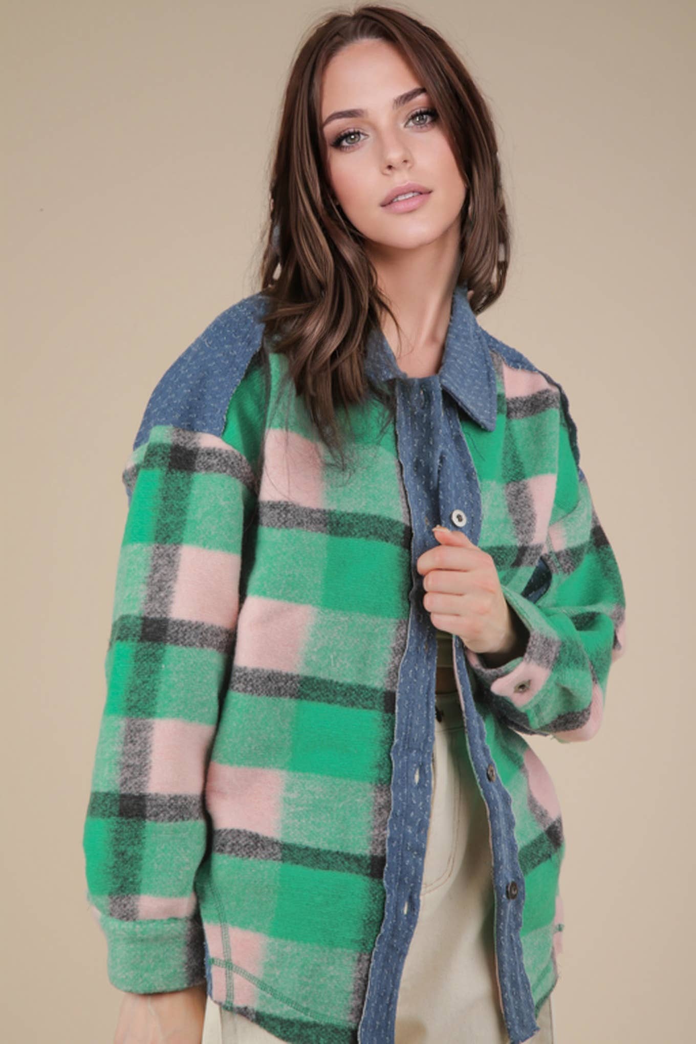 - Oversized Textured Denim Contrast Plaid Shacket Jacket - Button Down - Drop Shoulder - Long Sleeve (Model height: 5'10", wearing a Small) 100% POLYESTER